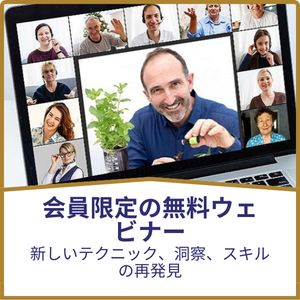 - さらに、すべての日本人会員は、世界的に有名な作家の Salvatore Battaglia(サルバトーレ・バッタグリア)、Madeleine Kerkhof(マデレイン・カークホフ)、E. Joy Bowles(E・ジョイ・ボウルス)、Suzanne Catty(スーザン・キャティ)、K.G. Stiles(K・G・スティルス)、Felicity Warner(フェリシティ・ワーナー)、Carol Rose(キャロル・ローズ)を含む、英語のウェビナーコレクションにもアクセスし翻訳字幕付きで閲覧できます。